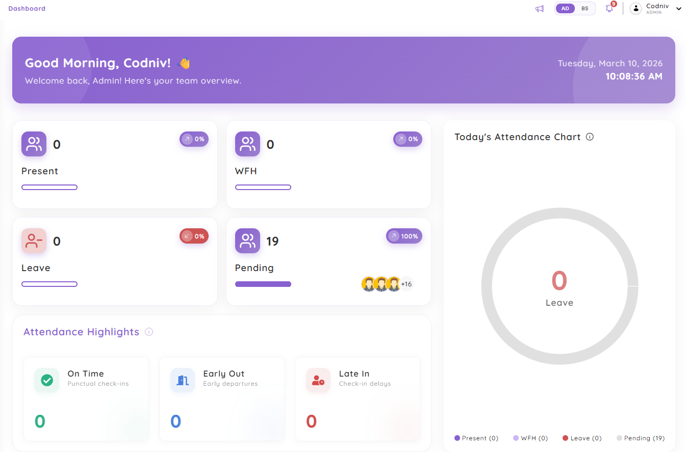 Start your day with a comprehensive overview. Admins see workforce distribution charts, pending approvals, attendance streaks, and upcoming birthdays. Employees get personalized stats, notices, and quick access to check-in controls. Everyone stays informed and aligned.